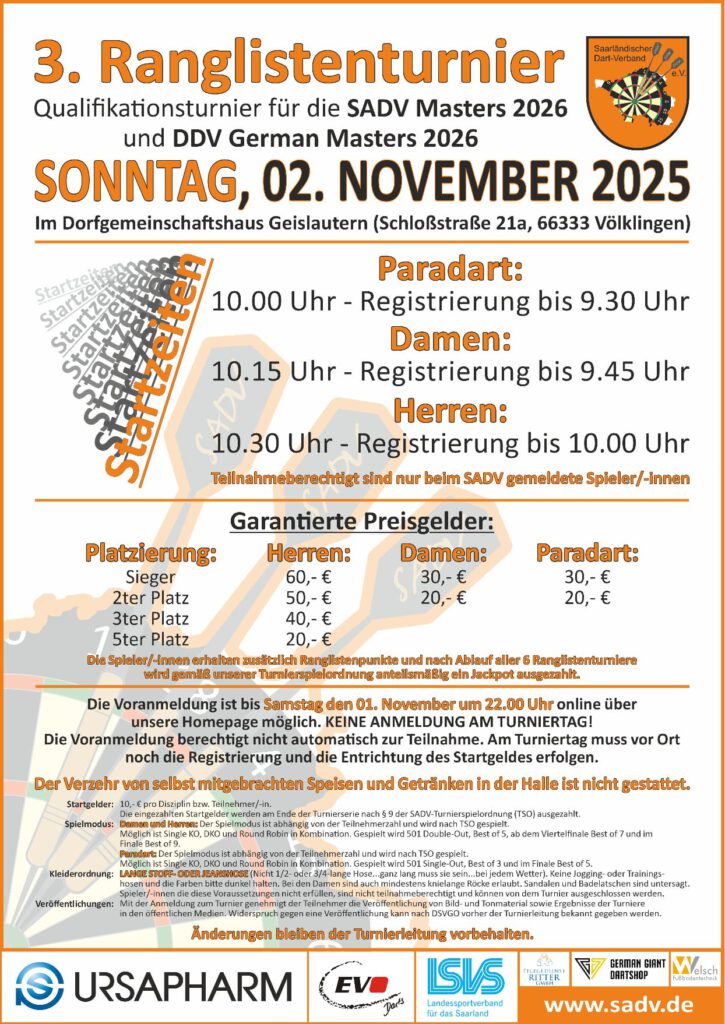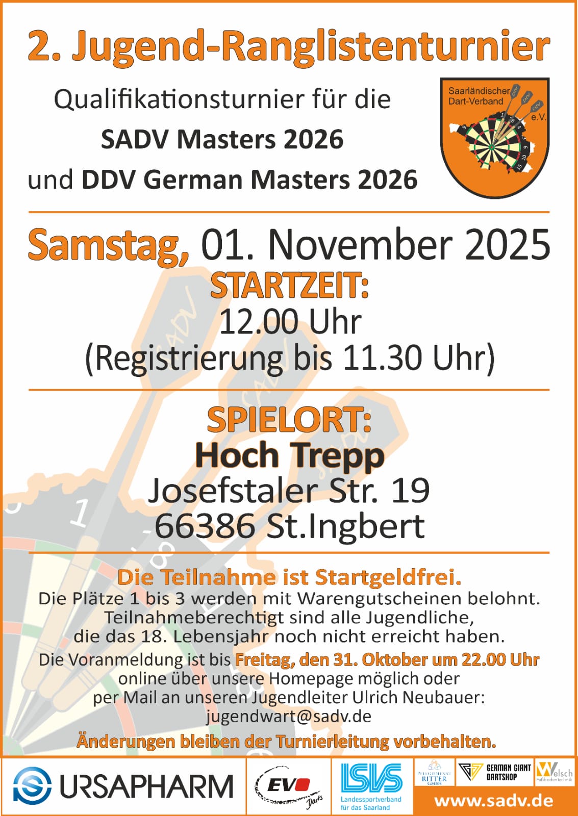 Der SADV ist der Dartverband für Steeldarts im Saarland. Hier findet Ihr Informationen zur Liga, Vereinen, Aktionen. Schaut einfach öfter mal rein.
