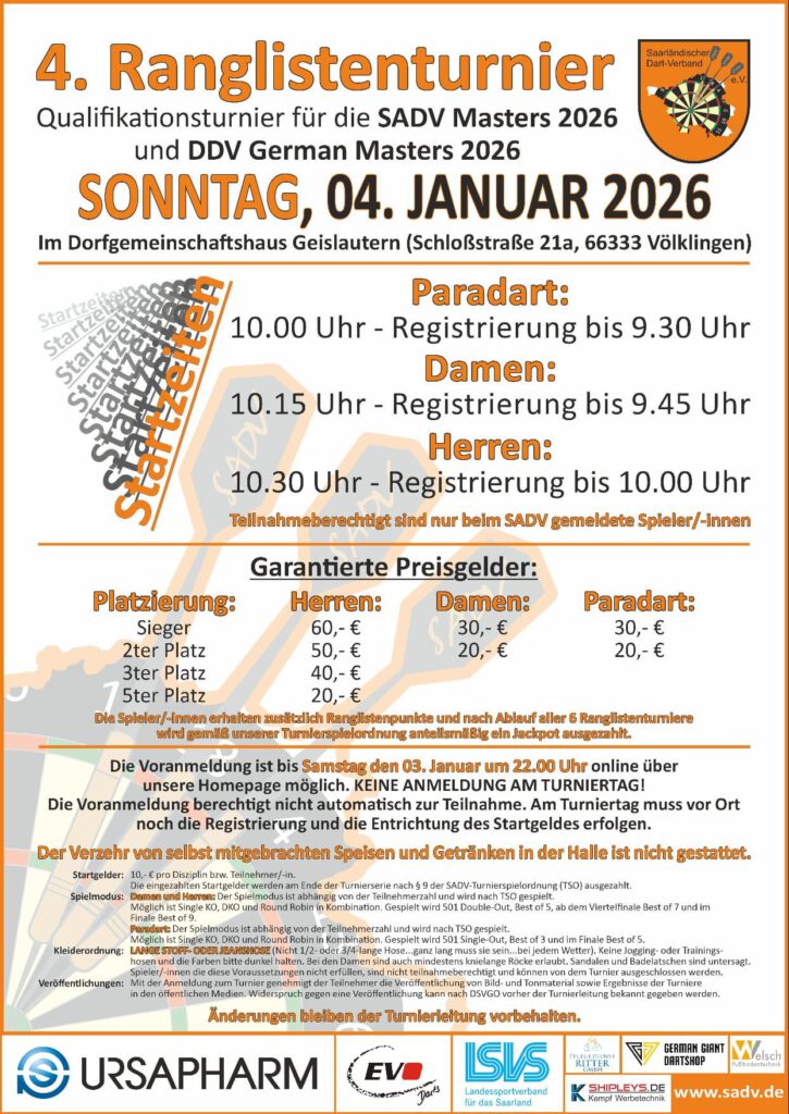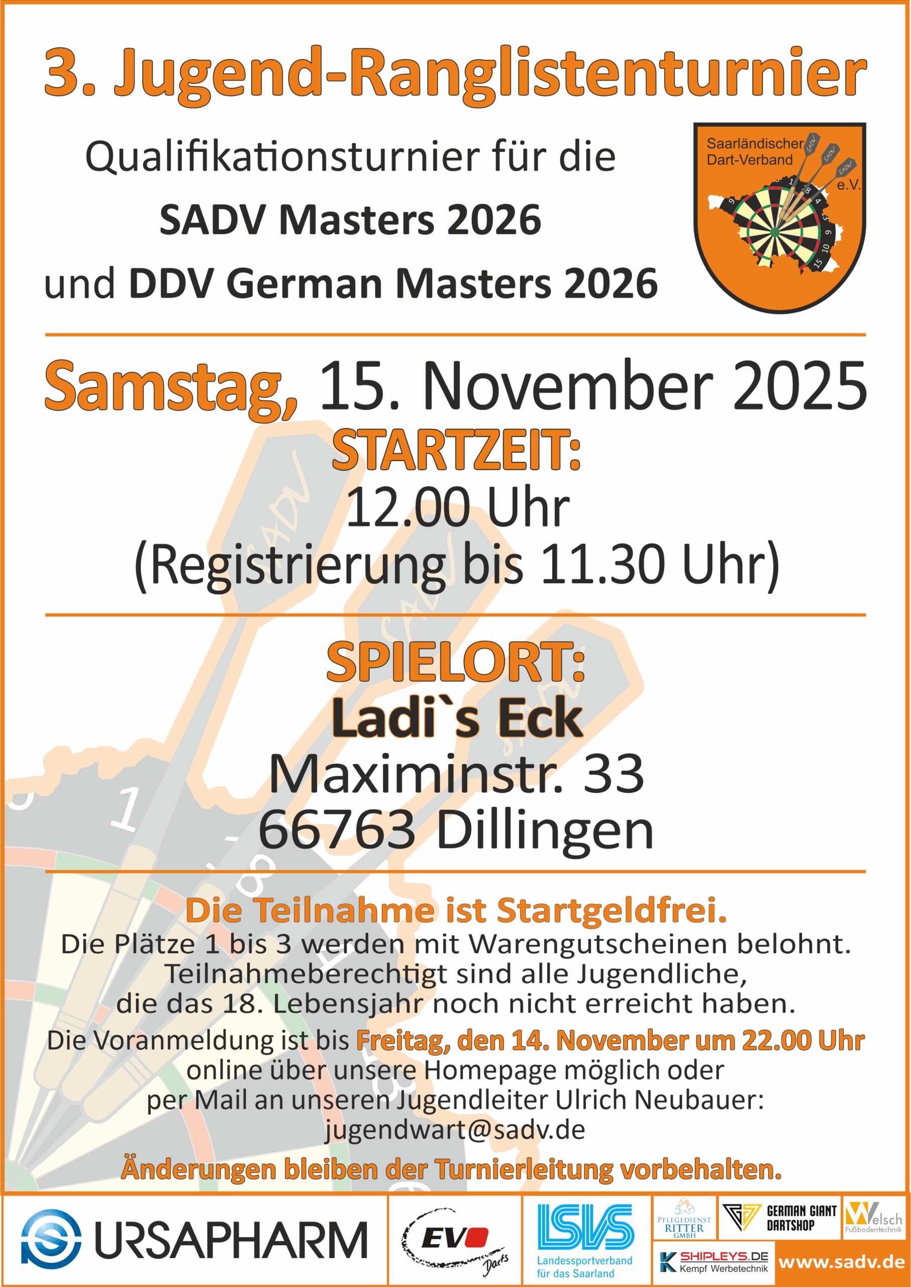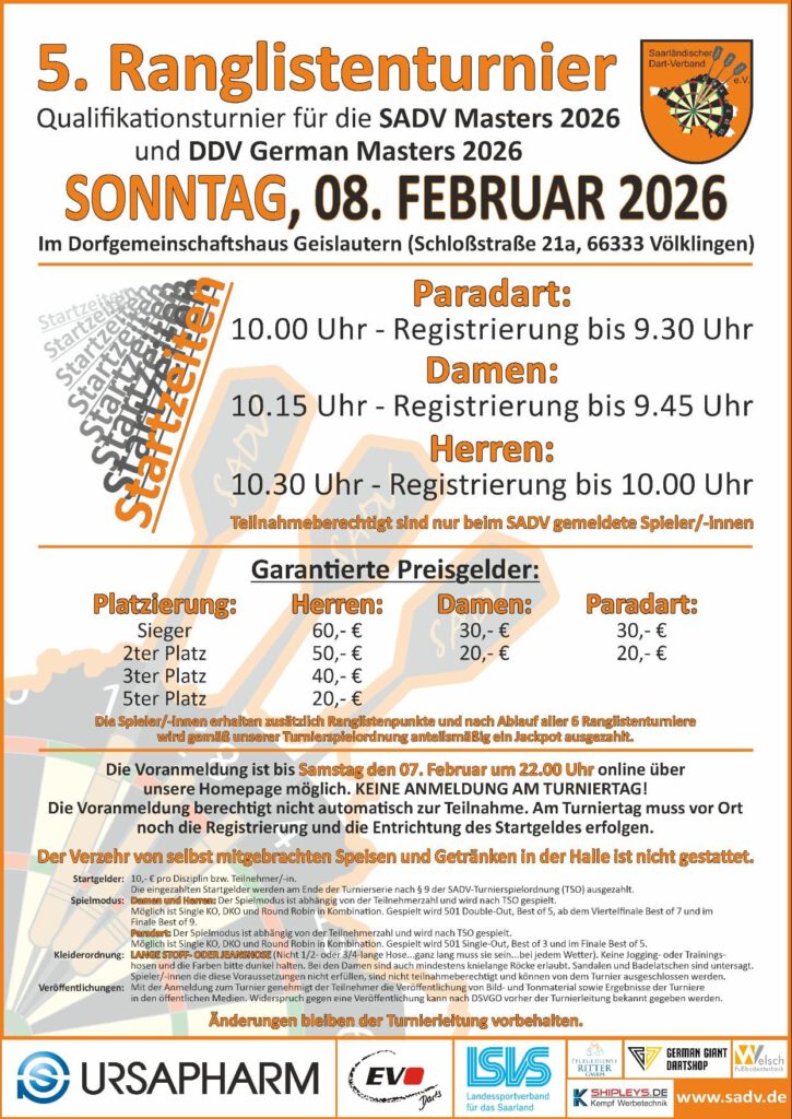 Der SADV ist der Dartverband für Steeldarts im Saarland. Hier findet Ihr Informationen zur Liga, Vereinen, Aktionen. Schaut einfach öfter mal rein.
